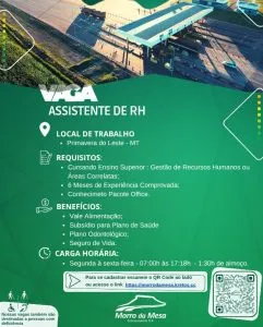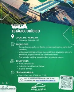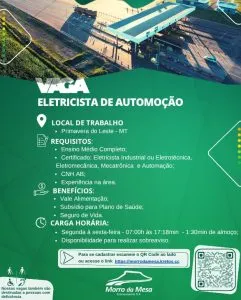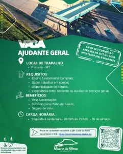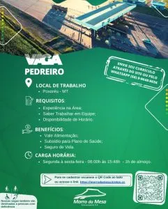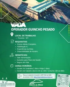 A concessionária Morro da Mesa está com vagas de emprego abertas para atuação nos municípios de Primavera do Leste e Poxoréu. As oportunidades contemplam diferentes áreas e níveis de escolaridade, desde funções operacionais até cargos técnicos e administrativos, incluindo vagas destinadas a Pessoas com Deficiência (PCD).